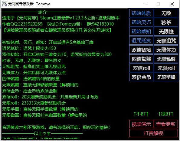 无间冥寺修改器。这是由贴吧大神专为无间冥寺游戏打造的辅助修改工具,内置强大功能,能够为玩家们提供诅咒抵抗、双倍初始、秒杀、无敌、无限钱、无视诅咒、无限roll等超多强力功能,让你轻松游戏体验不一样的乐趣。与此同时,无间冥寺修改器完美支持游戏的所有版本,不仅可以运用于steam官方版,学习版、盗版等版本都可以完美使用。只需要事先启动游戏,接着运行修改器,在游戏期间直接根据按键使用功能即可,非常的方便。喜欢的小伙伴还等什么,快来下载试试吧。