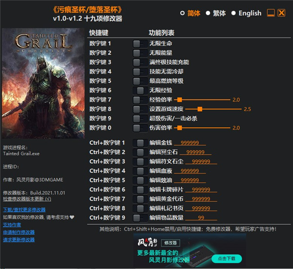 金钱最大、最大命运之石、启战斗修改、超级速度、物品无限等19项强大功能,让你可以轻松应对挑战,以大幅度减少玩家的游戏困难,从而提升游戏体验。另外,污痕圣杯修改器风灵月影版操作使用非常简单,只需下载打开修改器,再打开游戏按下对应的按钮,就能完美修改游戏数据,非常方便好用,喜欢玩这款游戏的朋友就赶紧来下载试试吧。