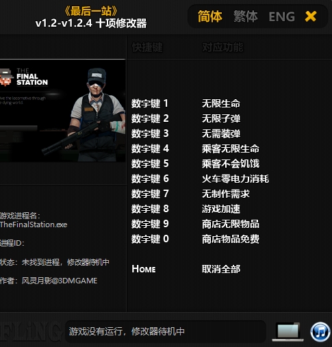 最后一站修改器是专为末世冒险类游戏《最后一站》所制作的一款游戏辅助修改工具,它由风灵月影制作,内置简体中文、繁体中文、英文三种语言界面,并且此修改器功能强大,便捷实用,能够让玩家一键实现开启乘客不会饥饿、商店物品免费、无限生命、火车零电力消耗等功能,大大降低了游戏难易程度,从而让玩家拥有更加舒适的游戏体验,一键解压,即玩即用,可谓非常的实用和方便,需要的玩家朋友们可自行在本站下载。