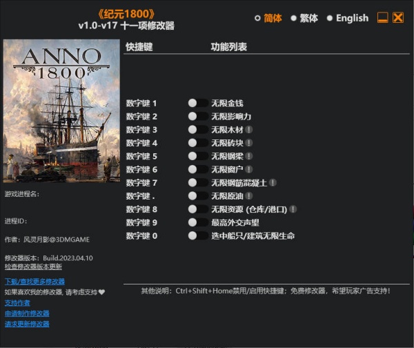 纪元1800修改器是专门针对《纪元1800(ANNO1800)》电脑游戏精心打造的一款辅助修改软件,它拥有无限金钱、无限木材、无限钢筋混泥土、无限窗户、无限砖块等十一项修改功能,只要使用了它,建造房屋、道路所需的材料都能轻易获取到,轻松完成各种任务挑战!