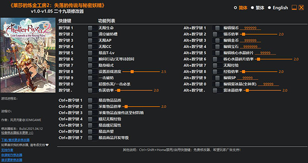 莱莎的炼金工房2修改器是一款专为《莱莎的炼金工房2:失落的传说与秘密妖精》电脑游戏所打造的多功能修改器。修改器界面清爽简洁,操作使用简单,能够为用户提供无限生命、清空破防槽、无限AP、无限CC、瞬间行动/无等待时间、隐身模式、设置游戏速度等多种功能,可以让你轻松打怪,体验游戏的乐趣!