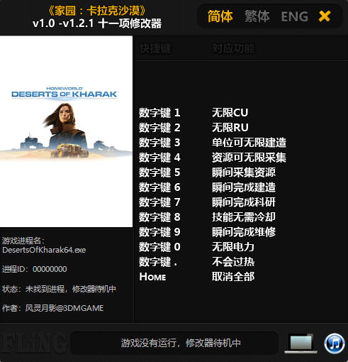 家园卡拉克沙漠修改器是一款专为《家园:卡拉克沙漠》游戏制作的多功能修改器,该修改器具有无限CU、单位可无限建造、无限完成科研、无限电力、不会过热等修改功能,可让你更快上手游戏,提升游戏乐趣。需要的玩家快来下载体验一下吧!