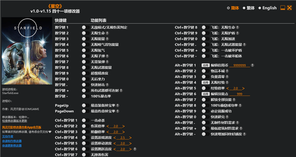 星空修改器是一款专门为《星空》游戏所推出的游戏数值修改器,它内置四十一项不同的修改功能,玩家可拥有无限喷气背包能量、无限氧气、所有武器可连射、最高装备掉宝率等加成,还可以设置移动速度和跳跃高度、编辑信用币以及技能点,帮助玩家在激烈近距离空战中夺得先机并抢占敌人的飞船、在一千个行星间探索各种基地并发掘各种植物,让玩家的探索宇宙的旅程更加简单有趣。