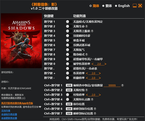 刺客信条影修改器是一款专门针对《刺客信条影》游戏所推出的游戏数值修改工具,它由所风灵月影制所作,旨在帮助玩家获得更轻松的游戏体验。刺客信条影修改器提供战斗强化(无敌模式/无限生命/技能无冷却)、资源作弊(无限金钱/经验/道具)、行动辅助(隐身/瞬移)等二十项实用功能,玩家可通过快捷键快速激活使用。但需注意:使用修改器可能破坏游戏平衡性,且存在闪退、存档损坏等兼容性风险,建议谨慎使用并提前备份存档!