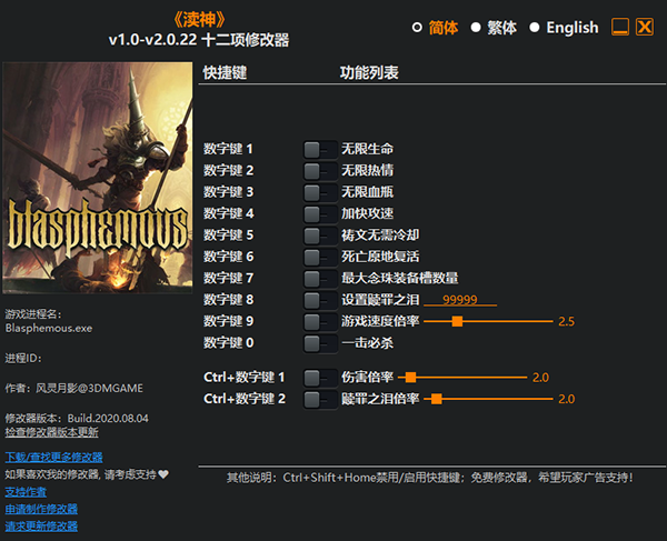 渎神修改器是一款专为2D像素风格的横版动作游戏《渎神》所打造的多功能修改器,它具有无限生命、无限热情、无限血瓶、加快攻速等修改功能,能够很好的帮助喜欢玩这款游戏的玩家体验到更为有趣的内容,大大的降低游戏难度。并且,渎神修改器使用操作简单,由风灵月影团队官方倾力推出,安全无毒无广告,支持简体、繁体、英文三种语言!