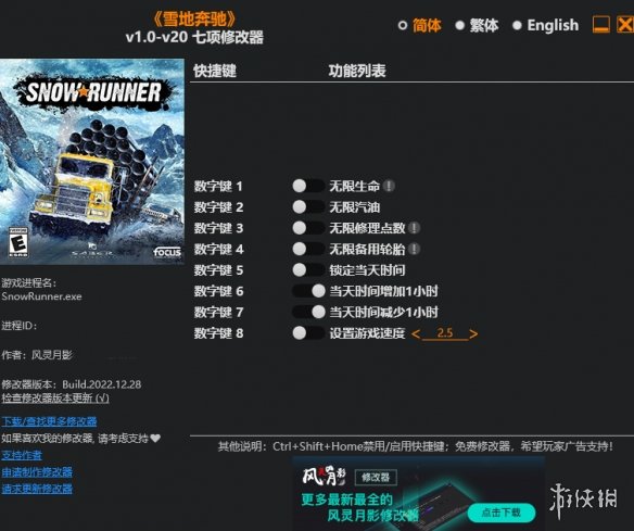 雪地奔驰修改器是一款专为开放世界驾驶模拟竞速游戏《雪地奔驰》所打造的多功能修改器,它提供无限生命、无限汽油、无限修理点数、无限备用轮胎、设置游戏速度等修改功能,可大大增强玩家的游戏体验感,更好的畅玩游戏!