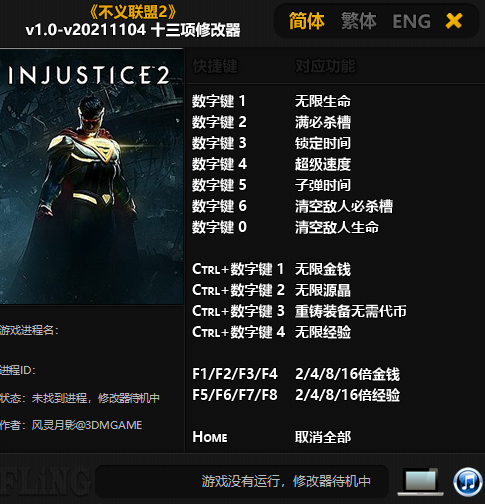 不义联盟2修改器是一款专为动作格斗游戏《不义联盟2》所打造的多功能修改器,由风灵月影制作,具有无限生命、锁定时间、子弹时间、清空敌人必杀槽、超级速度等功能,且修改器简单易用,玩家只需启动游戏、开启修改器即可进行修改,能大大降低游戏的整体难度。