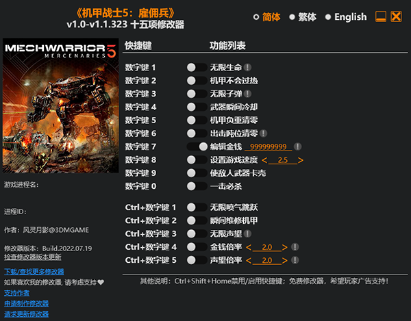 机甲战士5雇佣兵修改器是一款专为机甲战斗游戏《机甲战士5雇佣兵》所打造的多功能修改器,它能够为玩家提供无限生命、机甲不会过热、无限子弹等十五项堪称无敌的功能,大大的降低了游戏的难度,让玩家能够拥有一个非常不错的游戏体验!