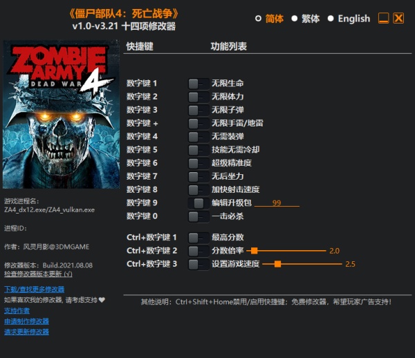 僵尸部队4死亡战争修改器是由风灵月影专为射击游戏《僵尸部队4死亡战争》所打造的多功能修改器,它能够为玩家提供无限生命、无限体力、无需装弹、一击必杀、加快射击速度等十四项修改功能,助力玩家轻松畅玩游戏!