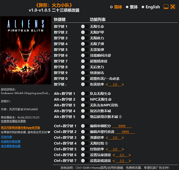 异形火力小队修改器是一款专为第三人称射击生存游戏《异形火力小队》所打造的多功能修改器,由风灵月影制作而成,具有无限生命、无限护甲、无限体力、无限子弹等二十三项修改功能,且修改器简单易用,玩家只需启动游戏、开启修改器即可进行修改!
