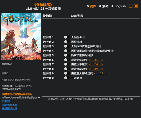 众神陨落修改器是一款专为第三人称打怪杀戮类奇幻游戏《众神陨落》所打造的多功能修改器,它提供无限生命、无限愤怒、无限执政官狂怒持续时间、无限武器能量、盾牌技能瞬间冷却、游戏速度、一击必杀等多项修改内容,且修改器简单易用,玩家只需启动游戏、开启修改器即可进行修改!