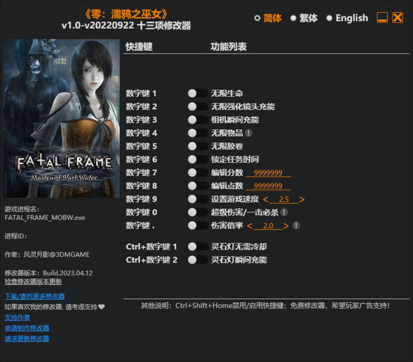 零濡鸦之巫女修改器是一款专为恐怖冒险游戏《零濡鸦之巫女》所打造的多功能修改器,玩家使用该修改器可以快速修改游戏当中的参数,比如无限胶卷、无限生命、编辑点数、伤害倍率等等,以此助你获得更好的游戏体验。同时,修改器的使用方法也十分的简单,玩家只需启动游戏打开修改器即可!