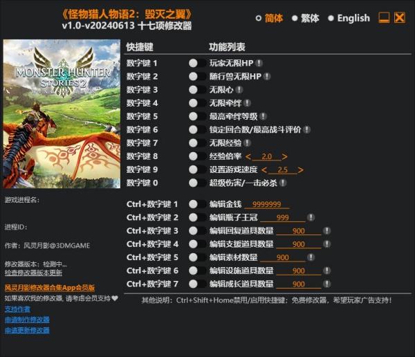 怪物猎人物语2破灭之翼修改器是一款专为日式动作冒险RPG游戏《怪物猎人物语2破灭之翼》所打造的多功能修改器,由风灵月影制作而成,可以修改游戏的各种属性,如玩家无限HP、随行兽无限HP、无限心等游戏内容,能够有效降低游戏难易程,且修改器简单易用,玩家只需启动游戏、开启修改器即可进行修改。