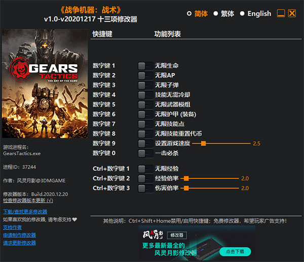 战争机器战略版修改器是一款专为回合制策略游戏《战争机器:战术》所打造的多功能修改器,由风灵月影,具有无限生命、无限AP、技能无需冷却、无限技能点等十三项修改功能,能大大的降低游戏难度,为玩家提供更好的游戏体验!并且,且修改器简单易用,玩家只需启动游戏、开启修改器即可进行修改。