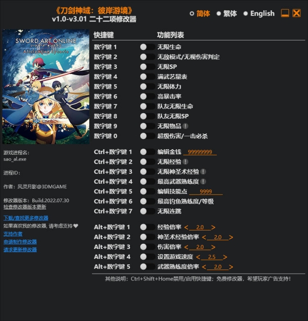 刀剑神域彼岸游境修改器是一款专为RPG游戏《刀剑神域彼岸游境》所打造的多功能修改器,它提供无限生命、无敌模式、无限SP、高暴击率等修改功能,玩家可以通过修改这些功能从而降低游戏难度,且修改器适用于游戏各个版本、简单易用,玩家只需启动游戏、开启修改器即可进行修改。