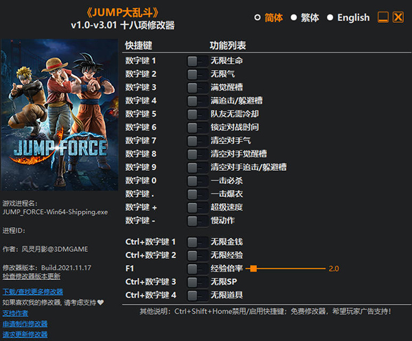 Jump大乱斗修改器是一款专为动作格斗游戏《Jump大乱斗》所打造的多功能修改器,修改器功能强大,拥有清空对手追击/躲避槽、无限金钱、2/4/8/16倍经验等十八项功能,且修改器简单易用,玩家只需启动游戏、开启修改器即可进行修改。