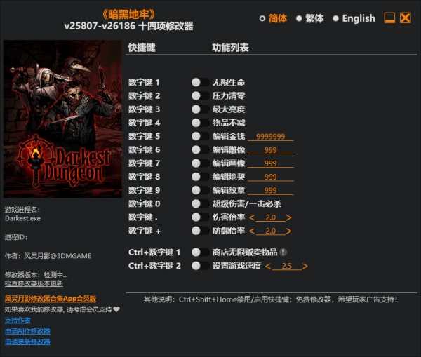 暗黑地牢修改器是针对同名游戏打造的辅助修改工具。它提供了多项游戏修改功能,如无限生命、压力清零、无限金钱、超级伤害/一击必杀等功能,更好的帮助玩家在游戏内斩妖除魔,提升玩家的游戏体验,帮助新手玩家更快的上手,有需要的朋友可以下载体验!