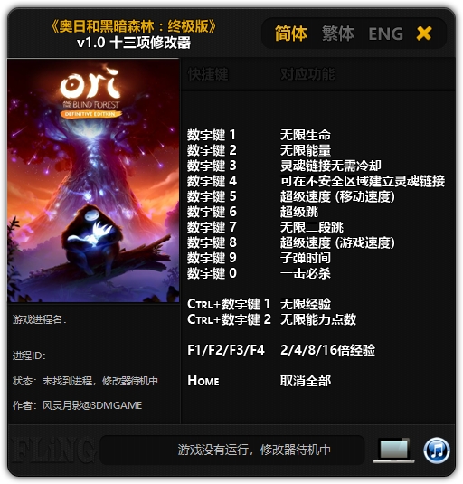 奥日与黑暗森林修改器是由风灵月影针对奥日与黑暗森林游戏制作而出的游戏修改器工具,利用它可以修改无限生命、无限能量、灵魂链接无需冷却等十三项游戏内容,为您降低游戏难度,有需要的玩家欢迎免费下载使用。