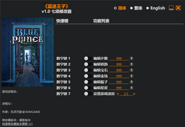 蓝途王子修改器是一款专门针对《蓝途王子》电脑游戏所推出的游戏数值修改器,它内置七项不同的修改功能,玩家可进行步数、钥匙数量、宝石数量、金钱、骰子数量、星星数量以及游戏速度等数值的修改操作,帮助玩家收集线索、破解机关、完成每日任务,一路摸索抵达46号房间,并逐步揭开隐藏在其中的秘密。