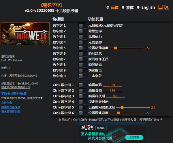 誓死坚守修改器是针对同名游戏制作的游戏数值修改工具。可以帮助玩家修改无敌模式/无视伤害判定、无限生命、无限体力等十六项游戏属性,能够大幅度减少的游戏难度。有需要的玩家欢迎免费下载体验。