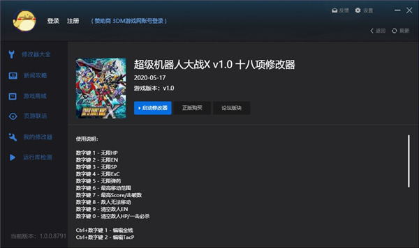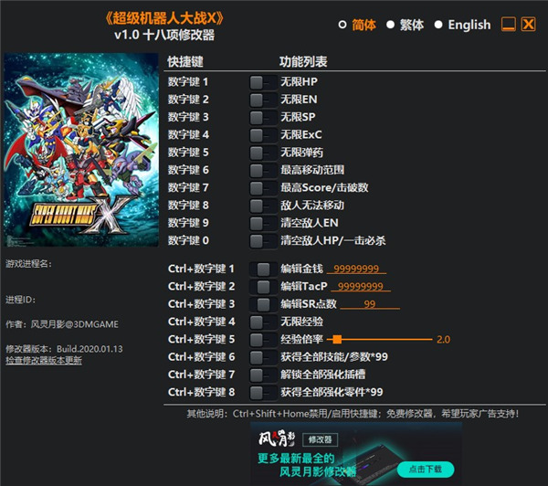 超级机器人大战X修改器是针对同名机甲战斗游戏打造的游戏修改工具,玩家下载使用后在游戏中可具备无限HP、无限EN、无限SP、无限ExC、无限弹药等十八项修改功能。帮助玩家降低游戏,更好的游玩,欢迎下载使用!
