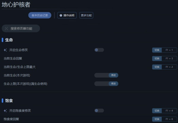 地心护核者修改器是专为同名游戏打造的游戏辅助工具,能够帮助用户解决游戏中所遇到的各种难题,轻松在地底世界生存。地心护核者修改器功能强大,提供了开启生命修改、饱食度修改、快速挖掘、工具耐久不减、最大伤害、快速击杀、材料不足仍可制作以及装备耐久不减等多项修改功能,玩家可以根据自己的游戏体验适当开启。有需要的朋友欢迎在本站下载体验。