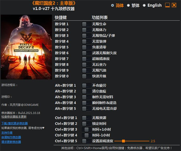 腐烂国度2主宰版修改器是针对同名游戏制作的游戏辅助工具,它提供了无限生命、无限体力、无限物品/子弹、无需装弹、负重清零、武器无限耐久度、超级精准度、无后坐力、无限汽油、快速升级等多项游戏修改功能,玩家使用后可以大幅度减少游戏困难,从而提升游戏体验,喜欢腐烂国度2主宰版的玩家可以下载腐烂国度2主宰版十九项修改器体验哦。