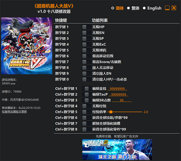 超级机器人大战v修改器是专为机甲战斗类游戏《超级机器人大战v》制作的游戏修改辅助软件,由知名团队风灵月影倾力推出打造。超级机器人大战v修改器操作简单,提供了无限HP、无限EN、无限SP、无限EXC、无限弹药、最高移动范围、敌人无法移动、清空敌人EN、一击必杀、编辑金钱、编辑TacP等十八项功能,能够很好的帮助玩家轻松游戏,大大降低游戏难度,带给玩家不一样的游戏体验。有需要的用户不要错过了,快来下载试试看吧。