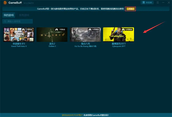 1、安装好了GameBuff修改器,首次启动软件GameBuff会自动检测,电脑中的所有游戏,默认的把游戏显示到“我的游戏”之中,只需要打开首页点击右上角的立即激活,输入在游戏加加领取的激活码即可免费使用GameBuff修改器。
