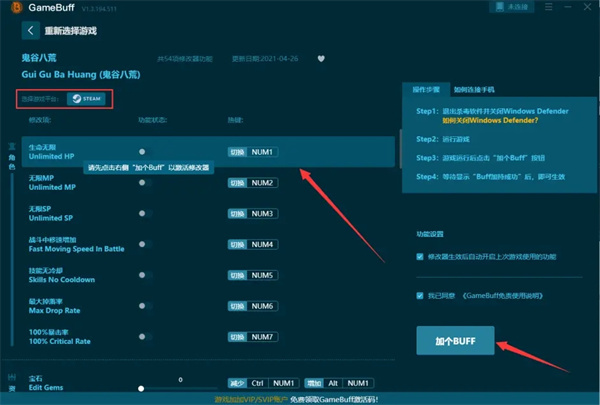 1、先进游戏再开GameBuff进行修改,如果还有不会操作的可以根据PC端右上角的操作流程进行。
