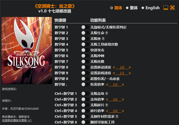 空洞骑士丝之歌修改器是一款专门为《空洞骑士丝之歌》游戏所推出的游戏数值修改器,它内置十七项不同的修改功能,玩家将拥有无限生命值、无限冲刺、上帝模式、无限跳跃等设定,还有无限丝绸、无限工具使用次数以及无限念珠等加成,帮助玩家探索虫之王国,迎战200+凶敌,在虫兽狂潮中杀出血路,揭开与身世交织的远古秘辛,直抵王国巅峰。