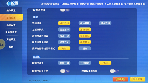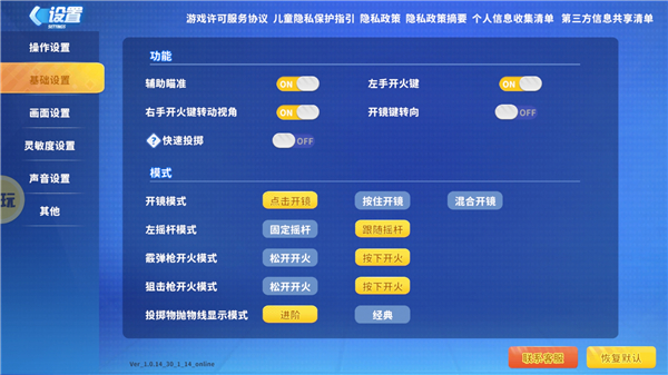 2.基础设置。基础设置,你们会看到功能功能里面没有什么好讲的主要就是辅助瞄准是要开的,因为这样子可以更好的射击对手,更容易精准的击败对手。模式里面开镜就点那个,点击开镜,因为新手还不是很奇怪按住开镜和混合开镜。陀螺仪的话,新手基本上不太会用的,所以就直接关闭。