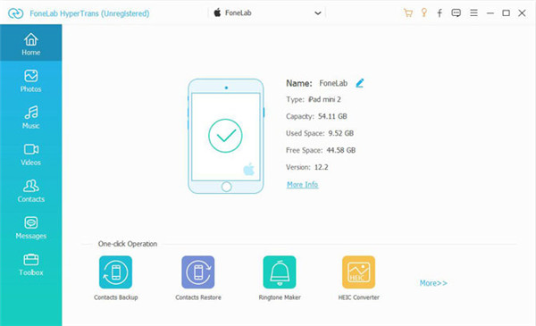 FoneLab HyperTrans官方版是一款简单实用且专业的无损数据传输应用,该软件界面简洁清爽,功能齐全且操作简单易用。可以很好的帮助用户在PC端和iPhone,Android,iOS手机端之间进行重要联系人、照片、音乐、视频等文件数据的快速传送导入操作,且完全不会对数据造成任何的丢失或损伤,并且还提供了贴心的文件加密、备份还原等功能,让你再也不用担心机密文件的泄露或丢失等问题。同时该软件还拥有智能化数据管理服务,支持用户一键式对联系人进行管理和信息添加、修改、删除等操作,还可管理电影,电视节目,iTunes U和其他视频等各类多媒体文件,更有铃声制作、HEIC图像转换等等功能无限制任你使用,绝对是你工作中必不可少的得力助手。有需要的用户赶紧来下载使用吧!
