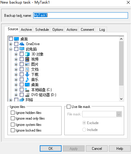 2、弹出如下的创建新任务的窗口,我们可以自定义选择要备份的来源。