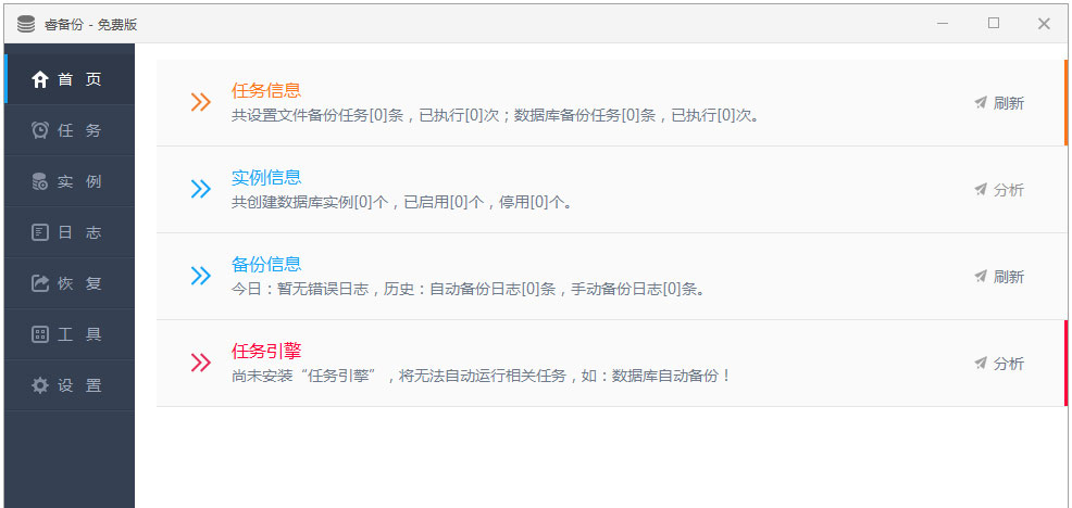 睿备份官方版是一款功能强大的自主数据库实时监控备份引擎,软件跨平台支持本地/远程MSSQL、ORACLE、MySQL、PostgreSQL、达梦等数据库完全、增量、事务日志备份或恢复,可以自由组合无限复合式备份任务;支持备份文件ZIP压缩后通过Lan/Ftp/云/Email传输存储,全面实现端到端、平台到端的备份指令推送与日志管理等功能。睿备份绿色版V3重磅来袭,新版本采用了全新的内核,无限制,全免费,借助自主“睿云”技术,对国内数据安全信息进行实时预感,当存在不稳定因素时,云端会自动下达备份指令,让数据安全无忧。