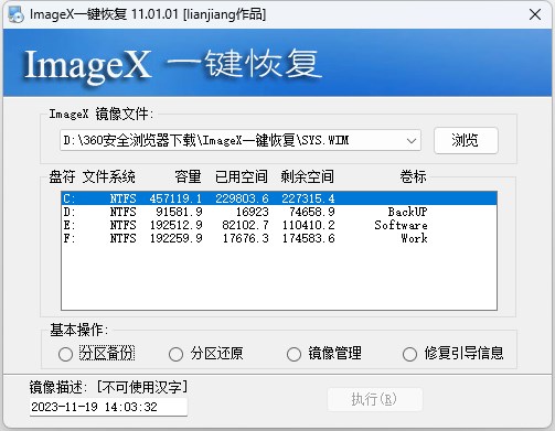 ImageX一键恢复是一个专业的系统备份和数据恢复工具,具有着分区备份、分区还原和镜像管理、引导信息修复等功能。分区备份可以帮助用户快速备份硬盘中的所有数据,并且备份完成之后用户还可以使用分区还原来还原之前备份的数据;镜像管理,可以进行镜像的具体管理,包括隐射到文件夹、隐射到文件夹、应用到文件夹和删除、提取镜像等操作。imagex采用了两种完全不同压缩算法,包括快速压缩和最大压缩,以此可以在最打程度上缩减映像的相关大小,并且用户还可以通过文件管理工具来添加、复制、粘贴和删除文件。