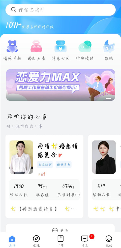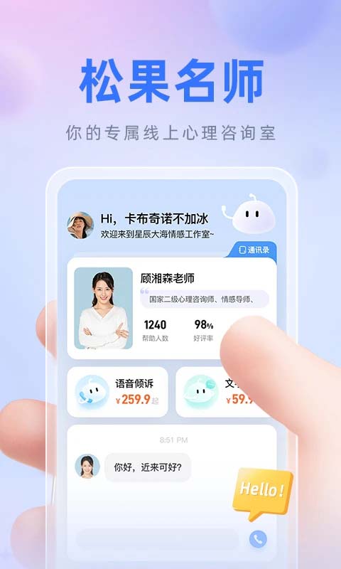 松果名师App是由松果倾诉团队推出的一对一心理情感倾诉咨询平台,软件汇聚多位知名心理老师以及资深倾听者,可为用户在线解答情感、恋爱、婚姻等问题,调节心理情感!松果名师App内用户可以与各位名师进行一对一专属咨询,且文字、语音等咨询内容全部安全加密,平台将保障每一位用户的隐私,您可以放心使用。