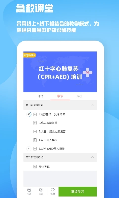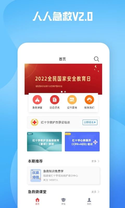 人人急救APP是一款专业的急救知识培训软件,提供一系列的急救课程,用户可以在选课中心选择要学习的课程,在新闻资讯里面了解最新的相关热点资讯,还能在里面报考救护员取证培训,缴纳相应的报名费就可以报名成功了,对于一些生活中遇到的紧急事情有着及时的救助措施,在问答详情里面有着各种平时常见的问题和详细的解答,一般的问题都可以在这里找到,专业为用户解答疑惑,在个人中心里面可以看到自己的详情和一些资料,普及应急救护知识,提高广大人民群众应对突发事件及意外伤害事故的自救互救能力,培训采取授课与实操演练两种形式,实操演练环节由红十字会专业授课师资、现场示教,手把手教学,让每一名学生都熟练掌握自救互救技能,小伙伴可以下载学习哦!