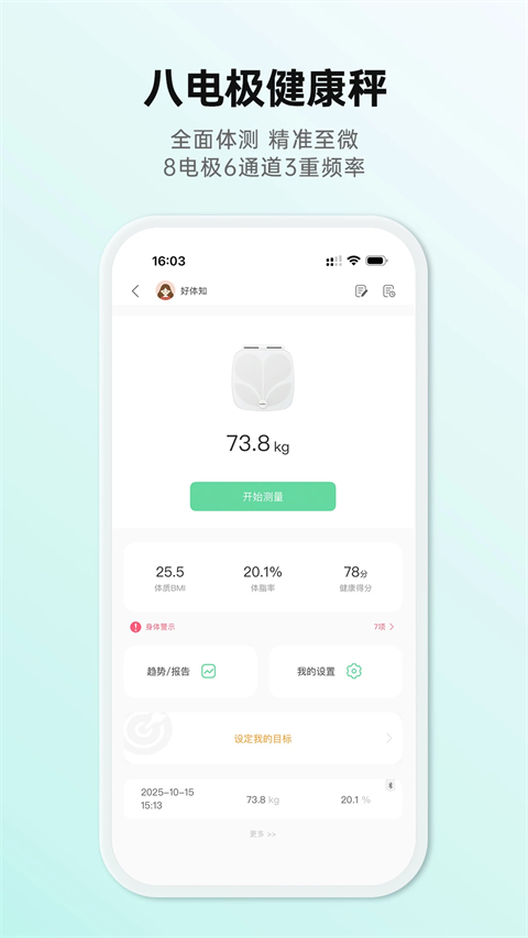 1、【实时评测】详细分析身体成分,健康数据实时掌控。