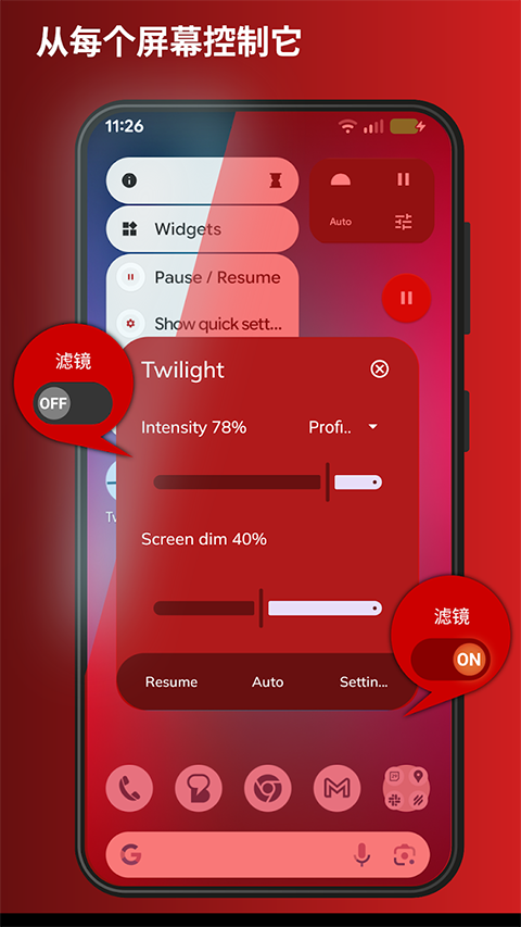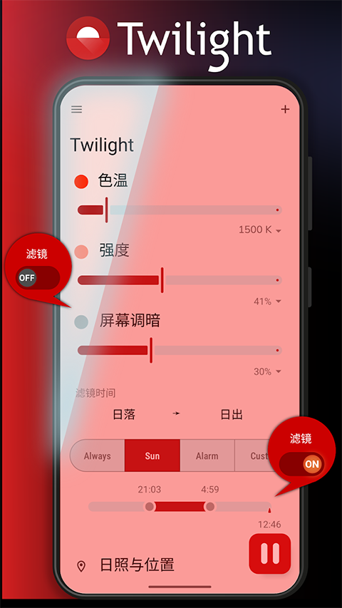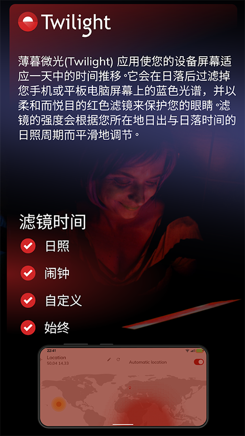 薄暮微光app是一款非常实用的手机护眼软件,它能使您的设备屏幕适应一天中的时间推移,在日落后过滤掉您手机或平板电脑屏幕上的蓝色光谱,并以柔和而悦目的红色滤镜来保护您的眼睛。薄暮微光功能十分强大,支持色温、强度、屏幕调暗、滤镜时间等参数调节,软件能够调节屏幕光源的亮度与颜色,减少蓝光从而达到护眼效果。