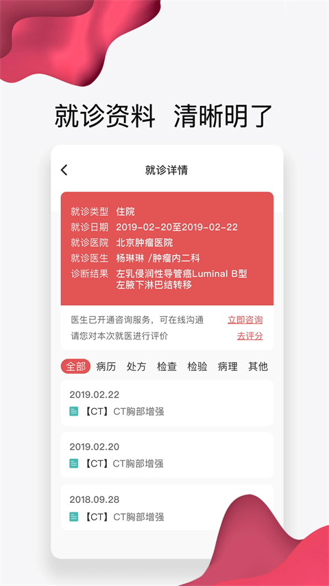 除了在北京肿瘤医院就诊的患者能够查询病历信息外,用户还可以自主上传电子病历,方便向医生咨询健康问题。同时,用户如果绑定了医疗卡,可以随时查看自己的健康记录和门诊记录,轻松了解每次检查的结果及相关费用账单。它还能医生的实时聊天功能,支持图文交流,让用户能够更方便地向医生咨询与沟通。就诊资料得以实时精准记录,每一次的就诊信息都清晰可见。同时,检查结果也能够及时传达给患者,保证用户在第一时间获取体检结果,有需要的用户可以来本站下载体验!