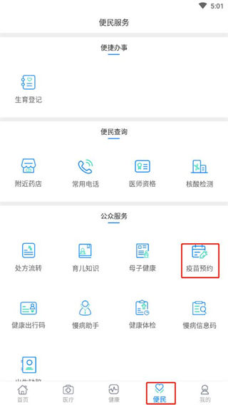 1、首先进入到“便民”界面,在该界面我们点击“疫苗接种”功能