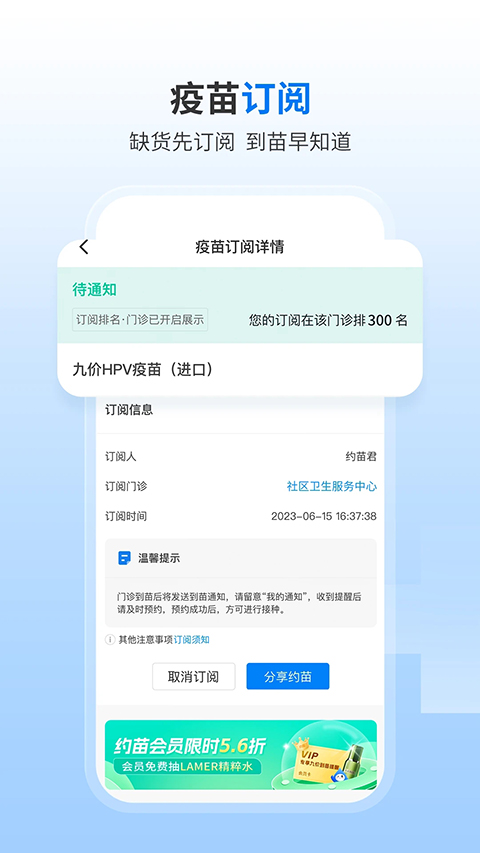 稀缺疫苗约不到?先来订阅到苗通知,门诊到苗后通知预约。