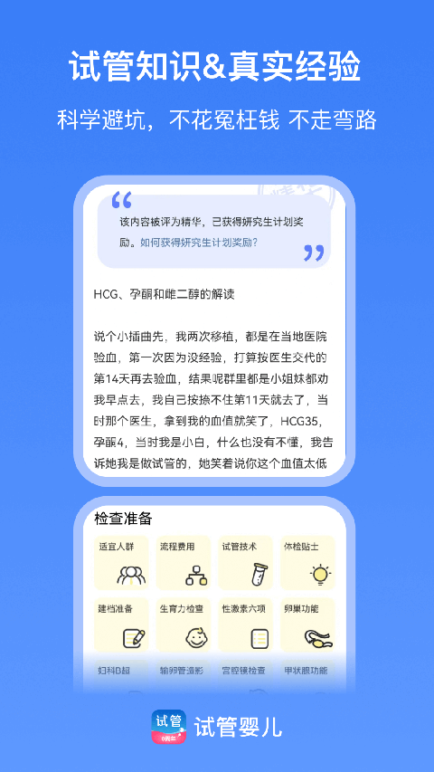 通过记录流程中的各类报告数据,包括检查分析、用药管理、试管账单、胚胎分析、HCG趋势等等,让试管好孕有迹可循。